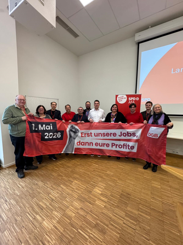 Ein sichtbares Zeichen setzten die Delegierten gleich zu Beginn der Konferenz. Gemeinsam mit Vertreterinnen und Vertretern des DGB wurde ein großes Banner präsentiert mit der klaren Botschaft zum 1. Mai 2026: „Erst unsere Jobs, dann eure Profite“. Damit machten AfA und Gewerkschaften deutlich, dass es in Zeiten wirtschaftlicher Unsicherheit vor allem um den Erhalt guter Arbeit, Tarifbindung und Mitbestimmung geht.