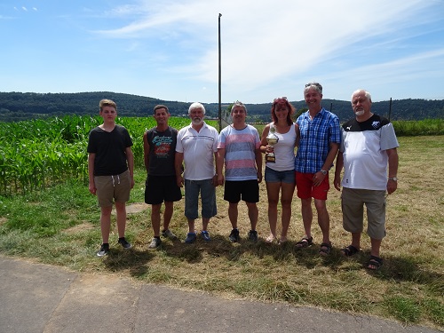 Der Wanderpokal des FC Binau ging in diesem Jahr an den AWO-Ortsverein, knapp vor der SPD-Mannschaft. Das Foto zeigt die Turnierleitung Gerd und Henrik Teßmer, die Sieger Oliver und Miriam Pieper (AWO), die Zweitplazierten Werner und Thomas Müller (SPD) und Wolfgang Ziegler als Drittplazierten.
